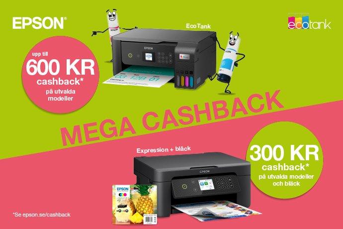 Cashback-erbjudanden på utvalda EcoTank-, Expression-skrivare. Erbjudandet gäller köp gjorda mellan 2025-10-01 och 2026-01-31. Villkor gäller.