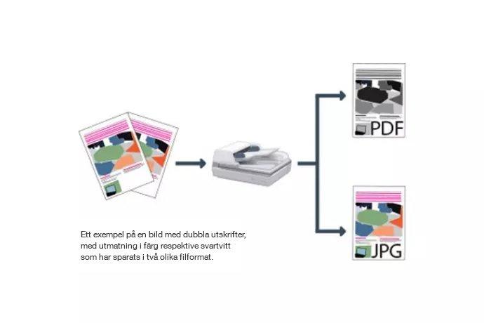 Dubbla bildutgångar gör att två olika filer kan skapas i en enda, till exempel versioner i färg respektive i monokrom. Du kan definiera separata inställningar för: